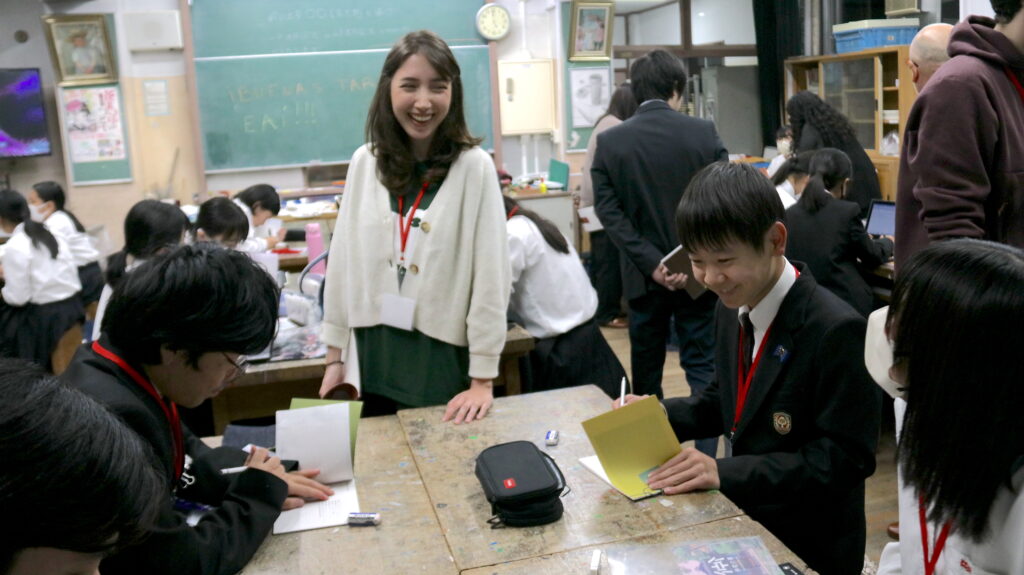 また、中国語を母語とする生徒は活動中に「もっと日本語と英語を頑張りたい」と私に語りました。異文化の言葉や考え方に触れたことで「コミュニケーションを取りたい」という気持ちが芽生えたのだと思います。その生徒がアーティストに自分の作品を説明するときには、自信を持って発言している様子が印象的でした。こうした変化から、このプログラムが生徒たちにもたらす影響の大きさを再認識しました。