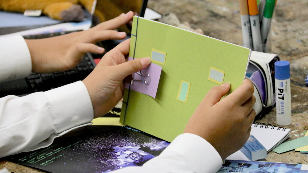 私は、初めてこの活動に参加したスタッフの一人として、また異なる文化的背景を持つ者として、芸術が異文化交流において果たす重要な役割を深く実感しました。例えば、活動初日、生徒たちはお互いにどのように接するべきか戸惑っている様子でした。その中で、「自分でできるのかな」と不安げに小声で呟く生徒もいました。しかし、時間が経つにつれ、隣の生徒とアイデアを出し合ったり、スタッフやアーティストからアドバイスを受けたりしながら、自分の考えを試してみるようになりました。一人の生徒が、トラベル・ジャーナルを作る過程で「どうすればもっとカラフルにできるか?」と相談しながら、少しずつ色やデザインを変えていく姿がとても印象的でした。最終的に作品を完成させた後、その生徒は「できるかどうか最初は分からなかったけれど、やってみたら楽しくなった」と話してくれました。この言葉は、アートを通じて不安を克服するプロセスを象徴しているように感じました。