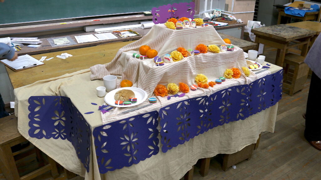 3日目は、メキシコのアーティストであるフロル・アルミンダ・ガルシア・レアさんが考案した創作ワークショップを行いました。彼女はメキシコの「Dia de Muertos / 死者の日」(亡くなった家族などと一緒に時間を過ごし祝う日)からインスピレーションを得ており、カラフルなキャンドル、パン、果物、パペル・ピカド(切り紙飾り)、骸骨の装飾を用いて、大好きなメキシコの祭りの雰囲気を日本で集められるもので再現しました。これにより、生徒たちはこの祭りが持つ感情や象徴性に触れる体験をしました。また、日本の「お盆」などの類似した伝統と比較することで、生徒たちは異文化の共通点や違いについて考える機会を得ました。