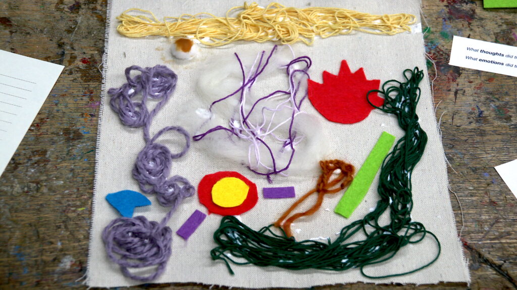 創作ワークショップでは、「ヴィジュアル・ポエム」(言葉を使わない詩)を生徒たちと作ることになりました。自分の大切にしていることや好きなこと、今の感情などを毛糸や綿などさまざまな素材を使って表現を探求していきました。何を作ろうか迷っている生徒たちに、フロル さんは、自分の友人との関係や幸せな気持ちになることなど日常生活でのエピソードを話し、そこからどのように表現できるかを一緒に考えていきました。このような創作を通したやり取りを通して、お互いの生活を少しずつ知っていく時間を過ごせました。