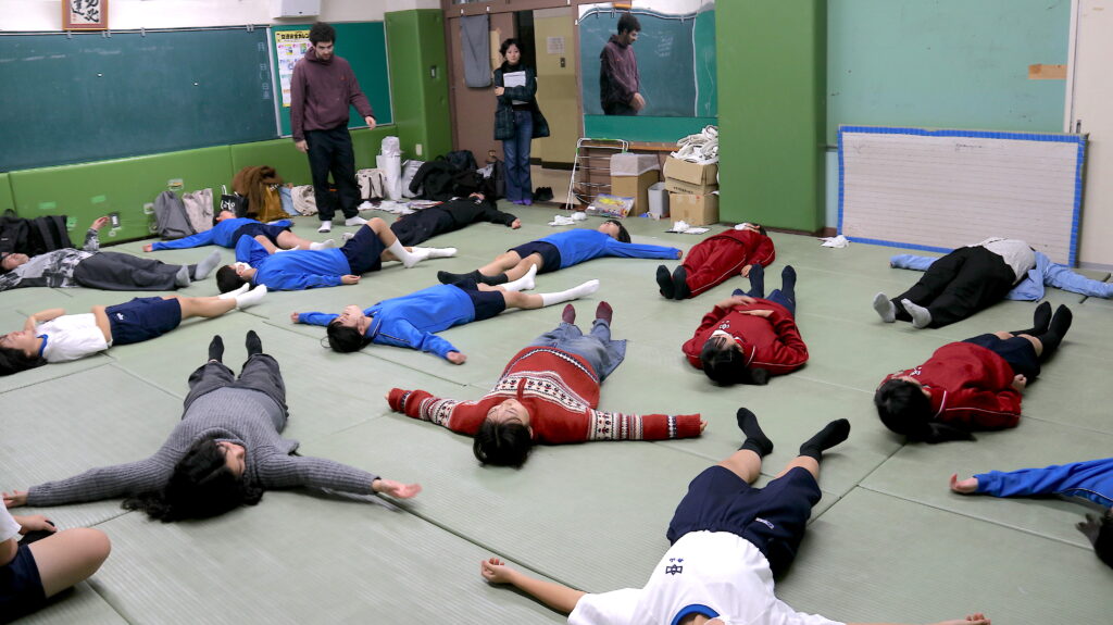 ウォームアップでは、アーサーさんが深い呼吸や地面を捉える方法を紹介し、自分の身体を空間と結びつける感覚を養うことを目指しました。また、コットンや布地を使って、質感や重さが動きや感覚にどのように影響を与えるかを考えました。これにより、生徒たちは身体と物の相互作用を直感的に学びました。