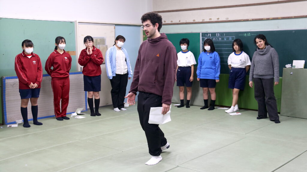 ブラジルのアーティストであるアーサー・デ・オリベイラさんは、「身体表現と物語」をテーマに、生徒たちが身体と想像力を通じて文化や創造性を探求するためのワークショップを行いました。この活動では、ブラジルの伝説の話、「野口体操※」、そして身体表現を組み合わせ、段階的なアプローチで理解を深めることを目指しました。